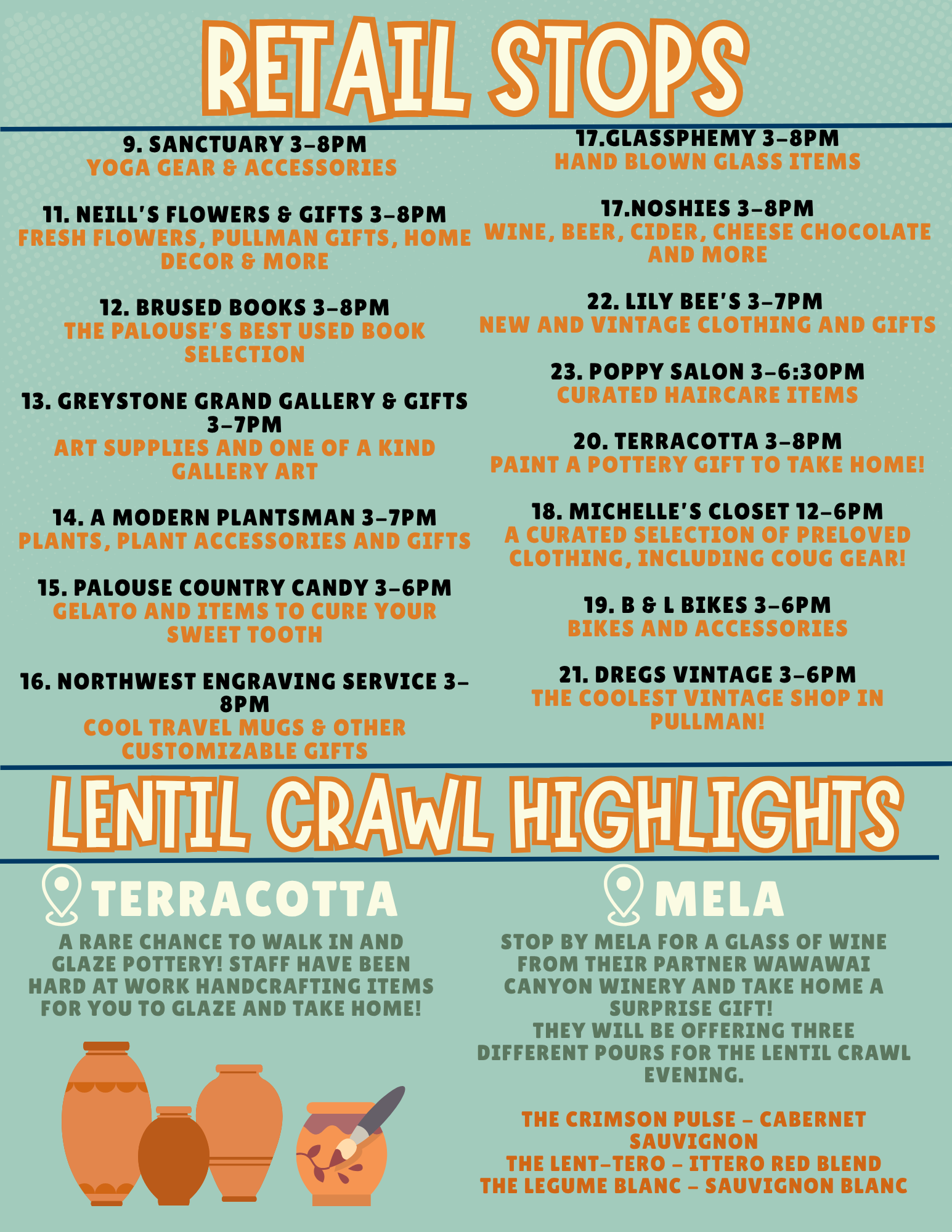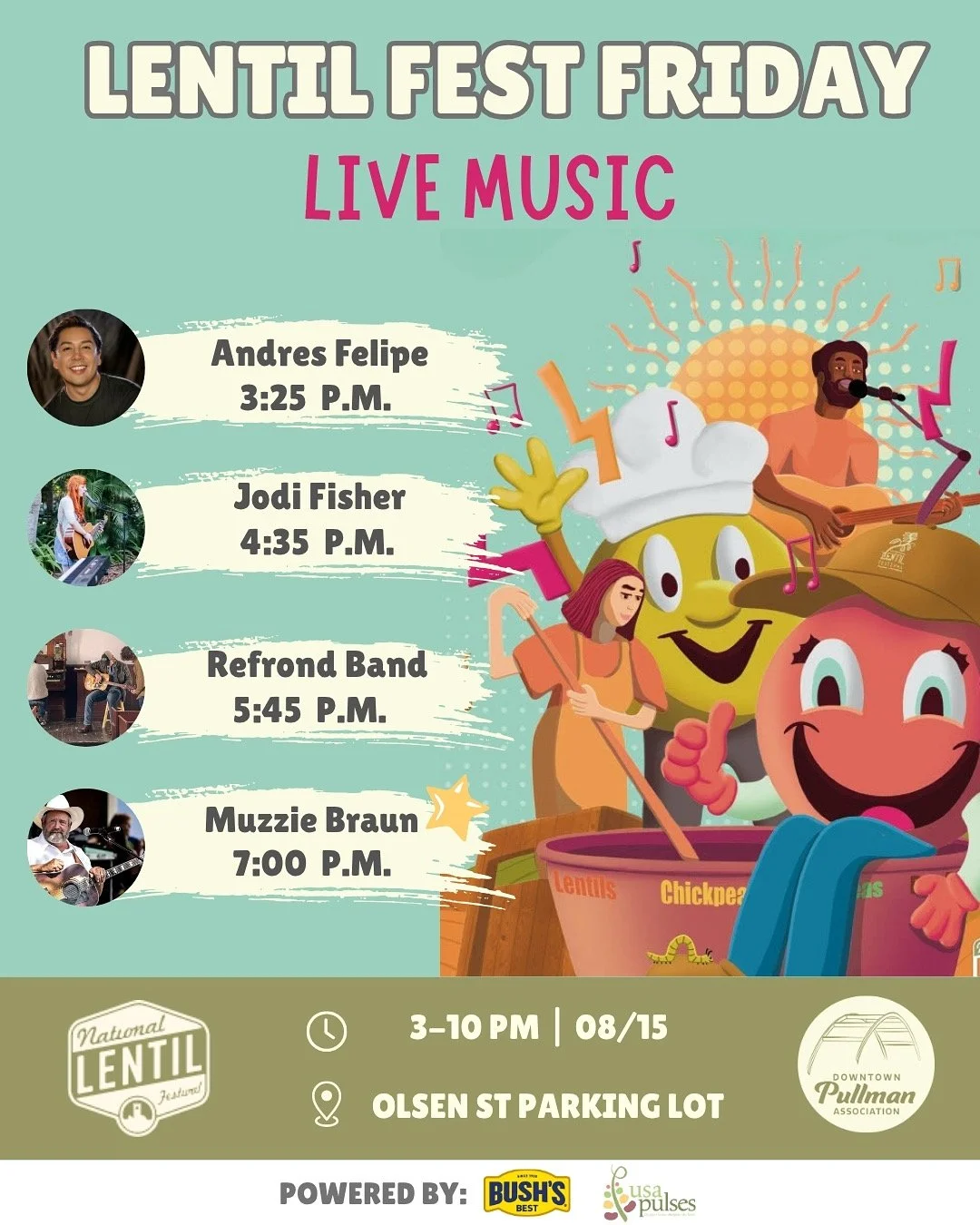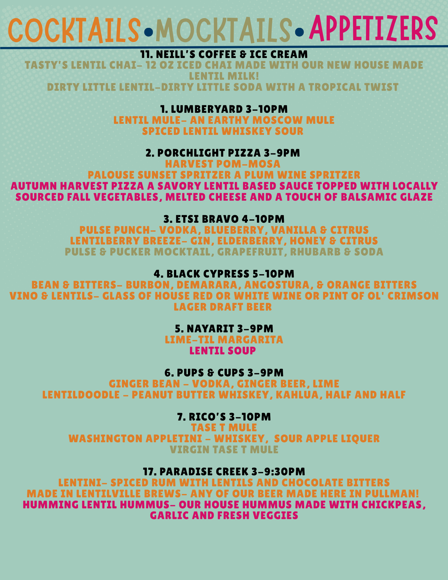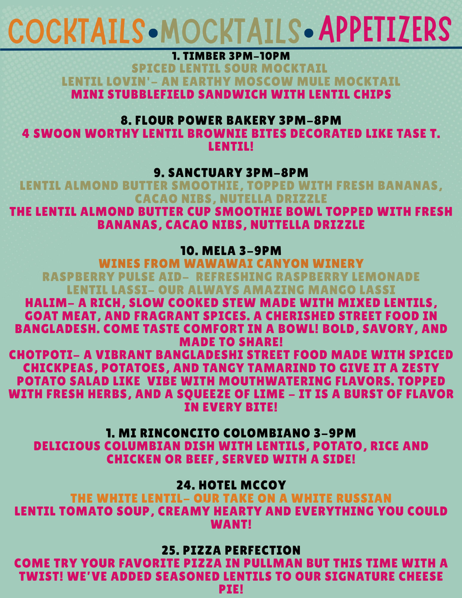 Join us for a deliciously fun evening in downtown Pullman as part of the Lentil Festival! Explore participating bars and restaurants offering creative lentil-themed appetizers and signature drinks. Sip, snack, and stroll your way through downtown while celebrating the Palouse’s favorite legume. Grab your friends and your festival spirit—it’s going to be a lentilicious night!