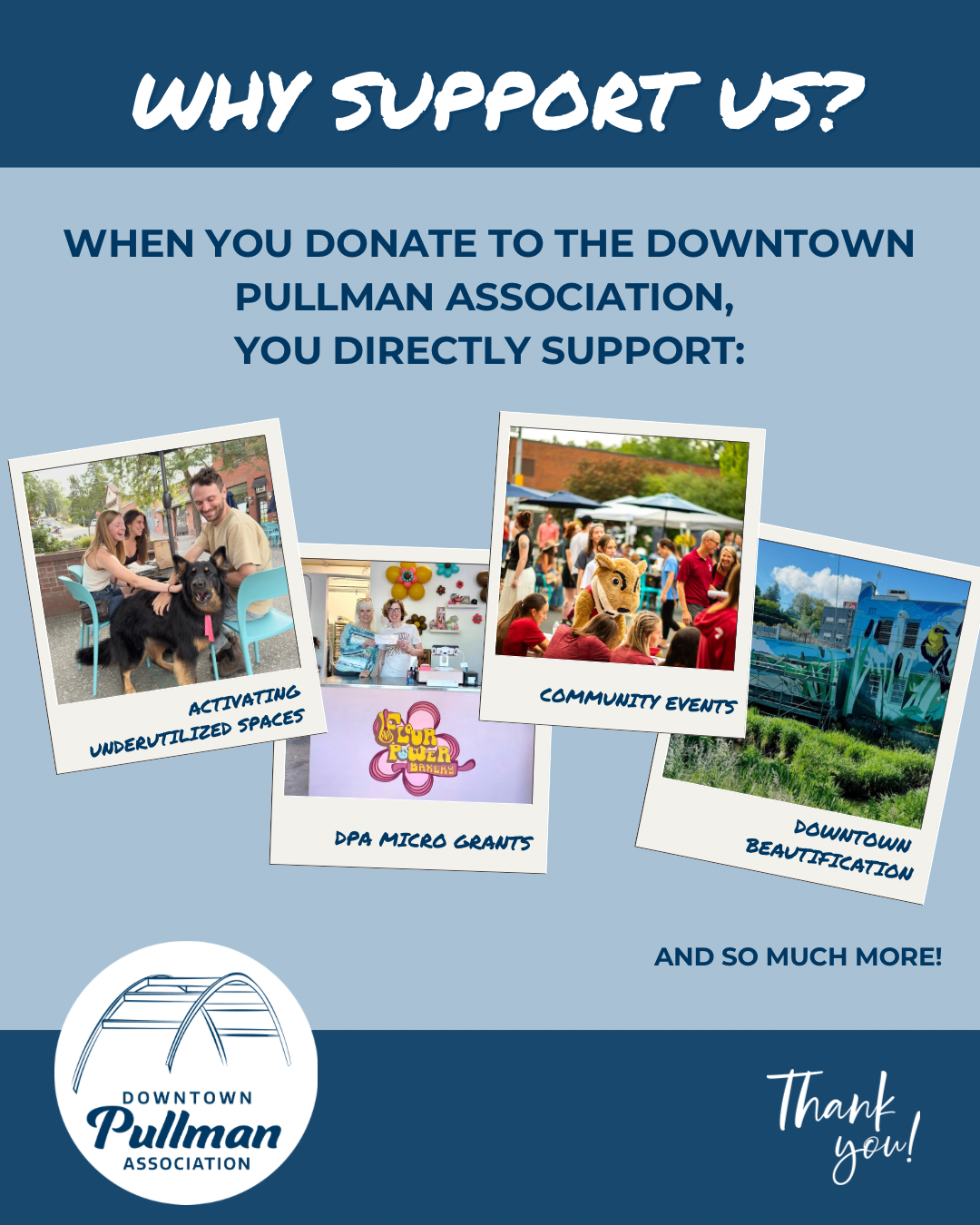 Make an impact today SUPPORT DOWNTOWN PULLMAN WITH YOUR CONTRIBUTION! General Fund Beautiful Buildings Grant $25.00 $50.00 $75.00 $100.00 Custom Amount Please enter an amount $ One-Time Donation Monthly Donation Support us by covering the fees we have to pay 3% Cover the Fee Donate Donate Custom Amount Please enter an amount $ One-Time Donation